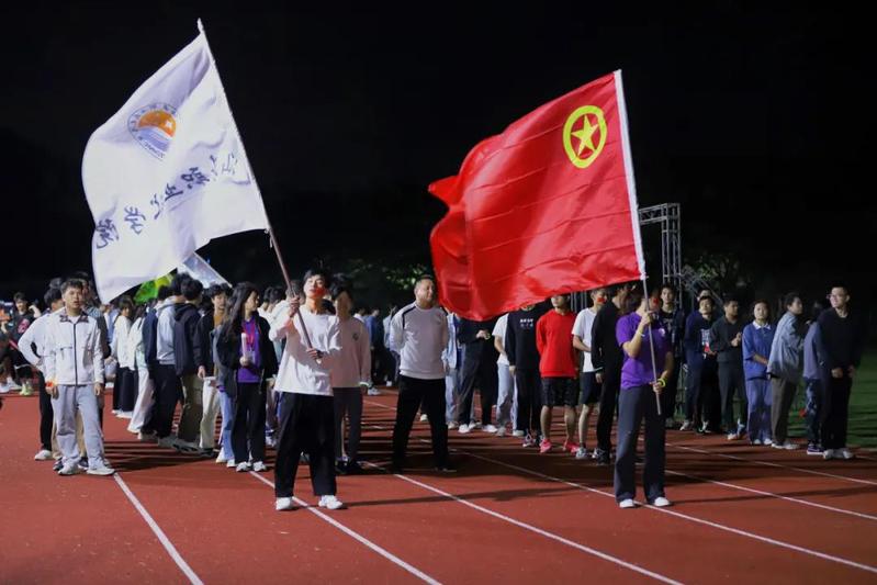 操场列队由老师、团学四大组织的同学、本部五大学系的同学组成六个方队共310人参与。学院院旗和各学系系旗由各个方队领旗同学高高举起。