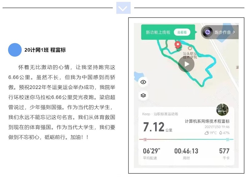 途中设有三个驿站,在汕职院里的夜晚下跑步,迎着微凉的晚风,遇到补给站微笑服务的志愿者们,那就是一场激情与温暖的融汇。